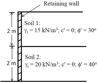 Two different soil types (Soil 1 and Soil 2) are used as back fill behind a retaining wall as shown in the figure, where ϒt is total unit weight, and c' and φ' are effective cohesion and effective angle of shearing resistance. The resultant active earth force per unit length (in kN/m) acting on the wall is:
