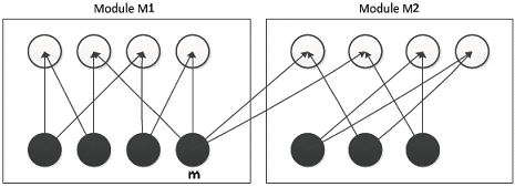 The following figure represents access graphs of two modules M1 and M2. The filled circles represent methods and the unfilled circles represent attributes. If method m is moved to module M2 keeping the attributes where they are, what can we say about the average cohesion and coupling between modules in the system of two modules?