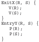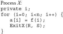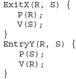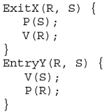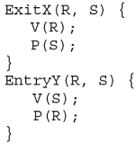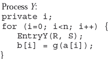A certain computation generates two arrays a and b such that a[i]=f(i) for 0 ≤ i < n and b[i] = g (a[i] )for 0 ≤ i < n. Suppose this computation is decomposed into two concurrent processes X and Y such that X computes the array a and Y computes the array b. The processes employ two binary semaphores R and S, both initialized to zero. The array a is shared by the two processes. The structures of the processes are shown below.