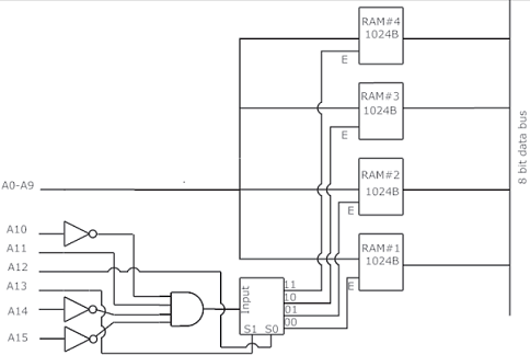 There are four chips each of 1024 bytes connected to a 16 bit address bus as shown in the figure below. RAMs 1, 2, 3 and 4 respectively are mapped to addresses
