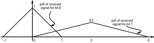 Bits 1 and 0 are transmitted with equal probability. At the receiver, the pdf of the respective received signals for both bits are as shown below.