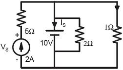 The current IS in Amps in the voltage source, and voltage VS in Volts across the current source respectively, are -