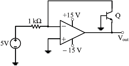 1. In the circuit shown below what is the output voltage (Vout) in Volts if a silicon transistor Q and an ideal op-amp are used?