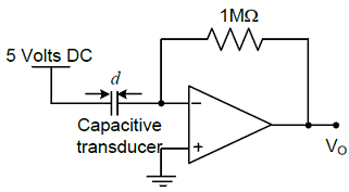 A capacitive motion transducer circuit is shown. The gap d between the parallel plates of the capacitor is varied as d(t) = 10-3[1 + 0.1 sin(1000 πt)]. If the value of the capacitance is 2pF at t = 0 ms, the output voltage VO at t = 2 ms is