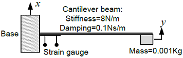 A strain gauge is attached on a cantilever beam as shown. If the base of the cantilever vibrates according to the equation x(t) = sin w1t + sin w2t, where 2 rad/s < w1, w2 < 3 rad/s, then the output of the strain gauge is proportional to