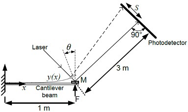 The deflection profile y (x) of a cantilever beam due to application of a point force F (in Newton), as a function of distance x from its base, is given by y(x) = 0.001F x2(1 - x/3)m. The angular deformation θ at the end of the cantilever is measured by reflecting a laser beam off a mirror M as shown in the figure.