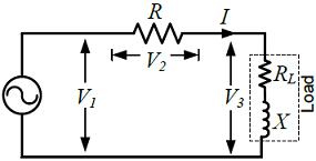 In the circuit shown, the three voltmeter readings are V1 = 220 V, V2 = 122 V, V3 = 136 V.