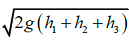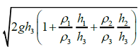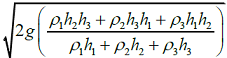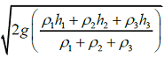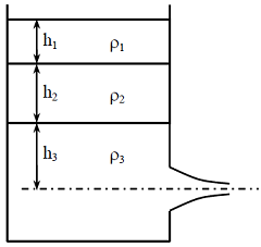 A large tank with a nozzle attached contains three immiscible, inviscid fluids as shown. Assuming that the changes in h1, h2 and h3 are negligible, the instantaneous discharge velocity is
