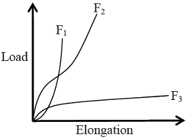 Consider the following assertion [a] and reason [r] in the context of the load-elongation curves of fibres F1, F2, and F3[a] Fibre F3 is the most suitable fibre for making a rope for mountaineering.