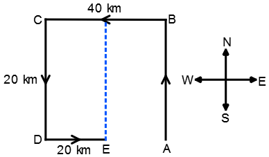- Sachin walks 20 km towards North. He turns left and walks 40 km. He again turns left and walks 20 km. Finally he moves 20 km after turning to the left. How far is he from his starting position?