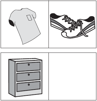 A T-shirt is to a pair of shoes as a chest of drawers is to a couch. The relationship shows to which group something belongs. The T-shirt and shoes are both articles of clothing; the chest and couch are both pieces of furniture.
