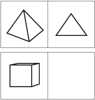 Pyramid is to triangle as cube is to square. This relationship shows dimension. The triangle shows one dimension of the pyramid; the square is one dimension of the cube.