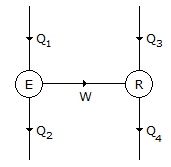 In figure shown, E is a heat engine with efficiency of 0.4 and R is a refrigerator. It is given that Q2 + Q4 = 3Q1. The C.O.P. of the refrigerator is