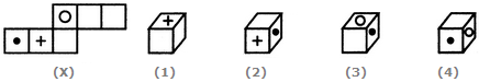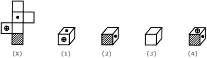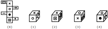 are the two faces and these two faces lie opposite to each other. Also, the face bearing the 'x' sigh lies opposite to the face bearing the black circle and the face bearing the white circle lies opposite to the face bearing the square (having a dot inside it). Now, the cubes in figures (2) and (4) consist of faces which are not formed when the sheet in fig. (X) is folded. Hence, these two cubes are not, formed. Therefore, only the cubes in figures (1) and (3) are formed.