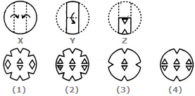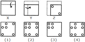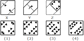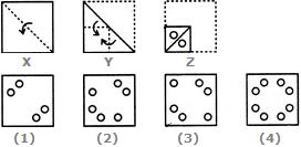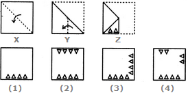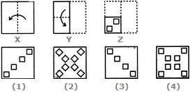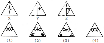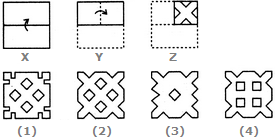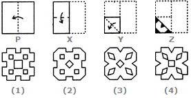 Each of the following questions consists of a set of three figures X, Y and Z showing a sequence of folding of apiece of paper. Figure (Z) shows the manner in which the folded paper has been cut. These three figures are followed by four answer figures from which you have to choose a figure which would most closely resemble the unfolded form of figure (Z).