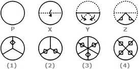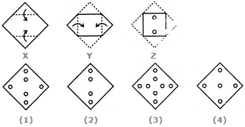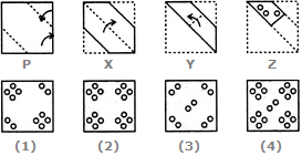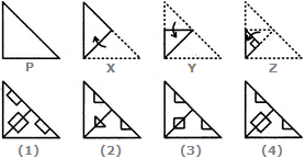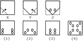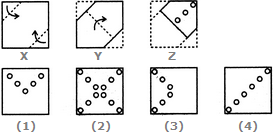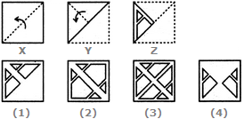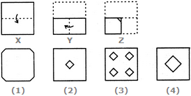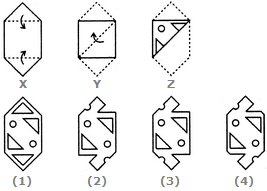 Each of the following questions consists of a set of three figures X, Y and Z showing a sequence of folding of apiece of paper. Figure (Z) shows the manner in which the folded paper has been cut. These three figures are followed by four answer figures from which you have to choose a figure which would most closely resemble the unfolded form of figure (Z).