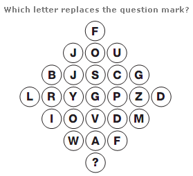 Start at the top of the diagram and work in rows, from left to right, top to bottom. Letters move through the alphabet in steps of 4, 5, 6, 7, 8, 9 and 10, before repeating this sequence.