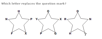 Starting with the top letter in each star, and moving clockwise around the others, letters advance through the alphabet in steps of 8 for the left hand star, 9 for the central star, and 10 for the right hand star.