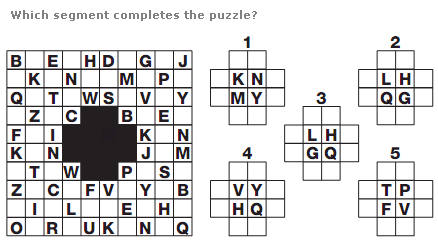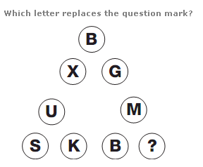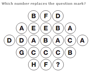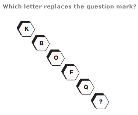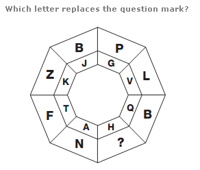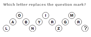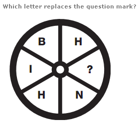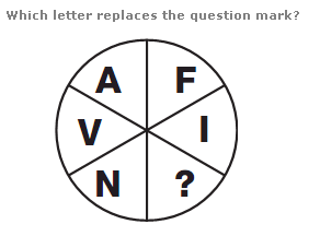 Starting with the A in the top left segment of the circle, and moving clockwise, letters follow a modified alphabetic sequence. To make the sequence, write the alphabet, removing all letters written with any curved lines, then take alternate letters from this sequence.