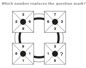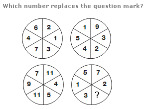 Numbers in the segments of the lower left circle equal the sum of the digits in corresponding segments of the upper circles. Numbers in the lower right circle equal the difference between numbers in corresponding segments of the upper circles.