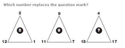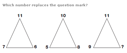 In each triangle, add together the lower two digits and subtract 2 for the left hand triangle, 3 for the middle and 4 for the right hand triangle, putting the result at the apex of the triangle.