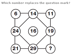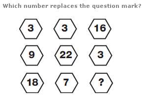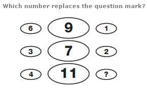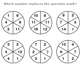 The values in the segments of the upper middle circle equal the sum of the values in corresponding segments of the upper left and right hand circles, and the values in the segments of the lower middle circle equal the difference between values in corresponding segments of the lower left and right hand circles.