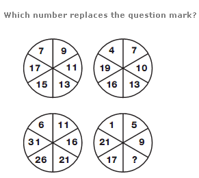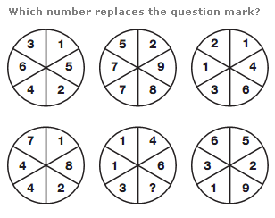 Taking the top row of circles, numbers in the central circle equal the sum of the numbers in corresponding segments of the left and right hand circles. In the bottom row, numbers in the central circle equal the difference between numbers in corresponding segments of the left and right hand circles.