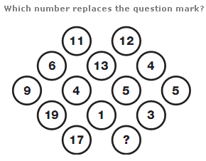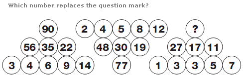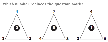 In each triangle shape, start at the left hand side of the longest row and move to the right, then on the next row and to the left, and finally to the third row. Add together the first two numbers and subtract 1 to give the next value around.