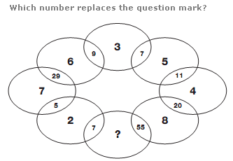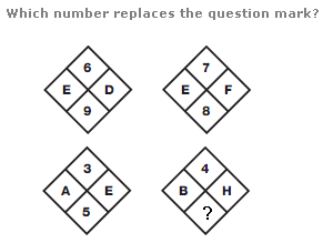 In each figure, calculate the difference between the upper and lower left hand numbers, and the upper and lower right hand numbers and multiply these differences together to give the value at the top.