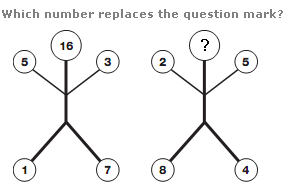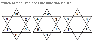 In each star, calculate the difference between the 2 left hand and 2 right hand numbers. The value at the top of each star equals the product of these differences, and the value at the bottom of each star equals the difference between these 2 differences.