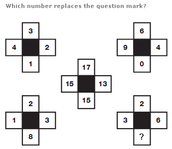 Take values in corresponding positions of the outer 4 shapes, and put the results in the central shape, rotating the position of this result by 1/4 turn each time.